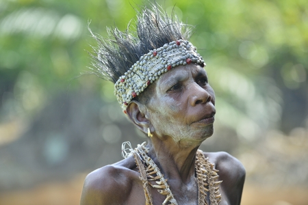 YOUW VILLAGE, ATSY DISTRICT, ASMAT, NEW GUINEA, INDONESIA - MAY 23: Portrait of an elderly papuan woman from the tribe of Asmat. Small village on the deep jungle of New Guinea. Indonesia. May 23, 2016