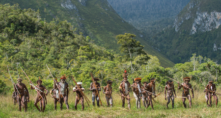 DANI VILLAGE, WAMENA, IRIAN JAYA, NEW GUINEA, INDONESIA - JUNE 4:The armed group of Papuans. Group of Warriors of Dani Dugum tribe prepare for war. June 4, 2016, New Guinea Island.