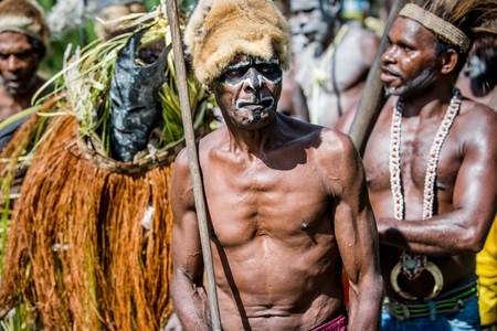 Hagen show, Papua New Guinea - circa August 2015: Native man with red colour on his face and grey beard and necklaces during Hagen show, Papua New Guinea. Documentary editorial.
