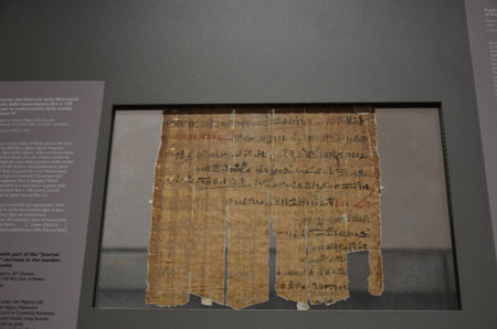 TURIN, ITALY - CIRCA MAY 2021: ancient Egyptian papyrus with hieroglyphic funerary text. Circa 1550 BC antique manuscript.