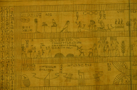 Egyptian ancient papyrus with different pictures and hieroglyphics