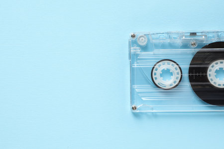 One audio cassette with magnetic tape on light blue background, top view. Space for text
