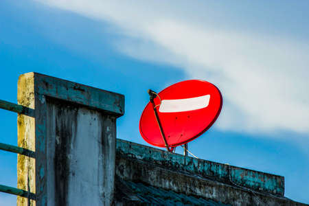 Satellite dish is on the roof of house on a clear day and have copy space.