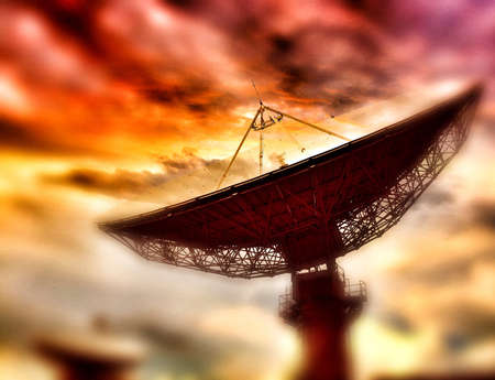 Large radio telescope. Dramatic sunset sky, glowing clouds. Nature, weather, science, equipment, technology, international security, communications, remote places