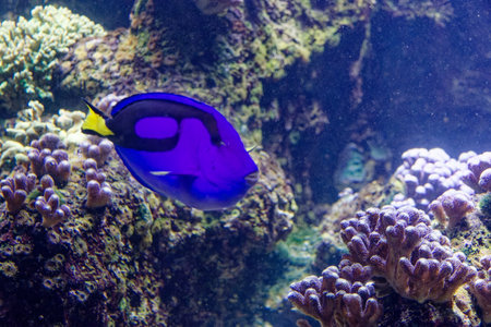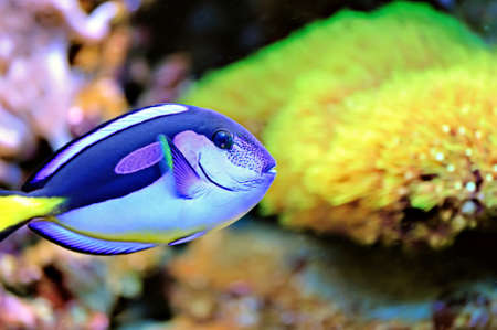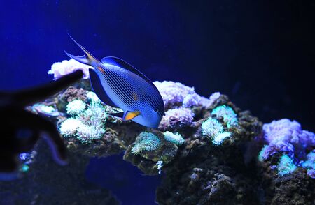 Paracanthurus hepatus, Blue tang in Home Coral reef aquarium. Selective focus. High quality photo