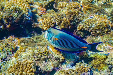Coral and fish in the Red Sea. In front is Red Sea surgeonfish, in background deep blue sea with other coral fish. Safaga, Egypt.