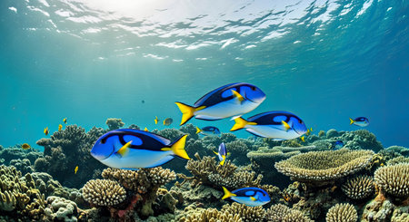 Blue tang fish swimming peacefully in a vibrant coral reef environment