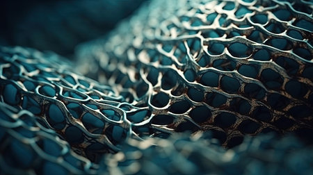 Complex network of interconnected strands creating an intricate, organic mesh structure, showcasing a captivating blend of design and technology. Generative ai