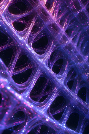 A complex D surface with crisscrossing lines and geometric patterns, featuring an intricate design with depth and texture in dark hues of blue and purple