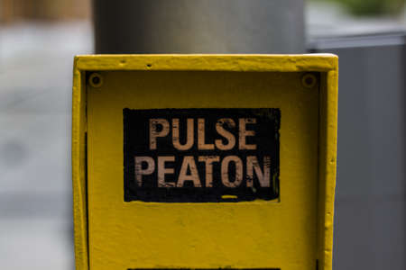 A closeup shot of a yellow traffic sign with the word PULSEPEATON