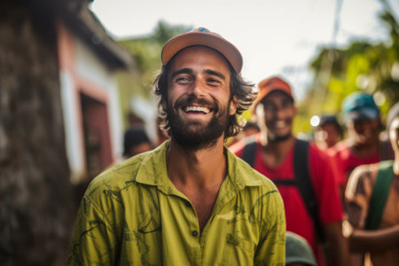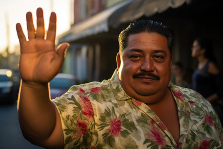 Festive street scene with smiling people in traditional Mexican clothing singing and dancing, AI generated
