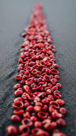 Vertical, full frame composition (9:16) showing a sharp, centered collection of small, deep red seas