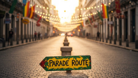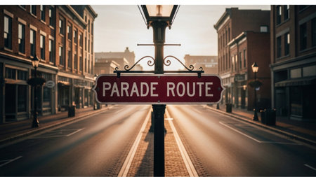 A cinematic wide environmental shot (16:9) capturing an ornate, vintage 'Parade Route' street sign m