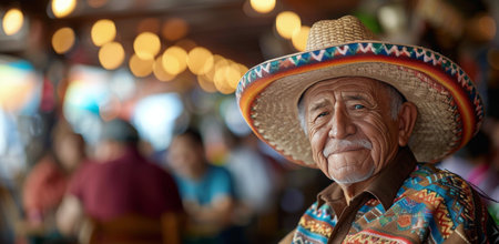 An elderly man with a wide smile wears a brightly colored, traditional Mexican hat while sitting in a busy restaurant.