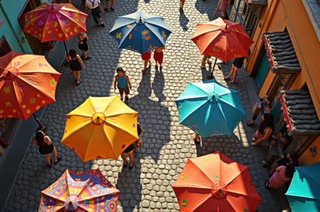 Colorful umbrellas casting shadows in a vibrant cobblestone street market scene. That the image is generated using AI.