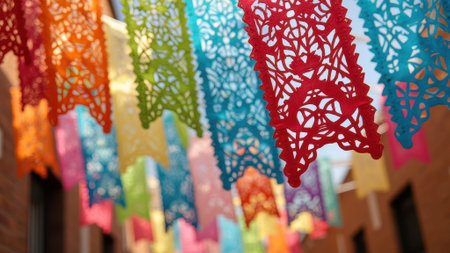 Colorful papel picado decorations hang outdoors in festive atmosphere. That the image is generated using AI.