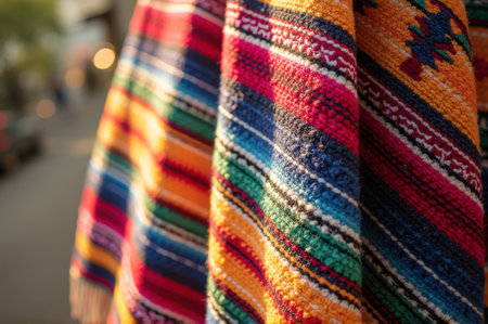 Vibrant mexican serape textiles displayed outdoors during sunset. That the image is generated using AI.