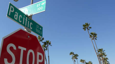 Pacific street road sign on crossroad, route 101 tourist destination, California, USA. Lettering on intersection signpost, symbol of summertime travel and vacations. Signboard in city near Los Angeles.
