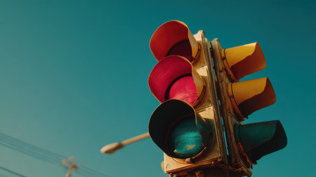 A close-up view presents a traffic signal featuring illuminated red, yellow, and green lights. The composition is set against a clear, azure sky, enhancing the vibrant colors of the signal. The image has a vintage aesthetic and could be used for illustrations related to traffic or transportation.