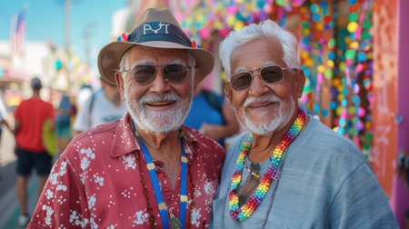 a couple of happy older gay men at a gay parade in smart clothes. There are rainbow flags and happy laughing people all around them. AI generated