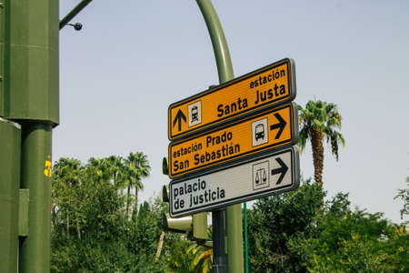 Seville Spain August 11, 2021 Street sign or road sign, erected at the side of or above roads to provide information to road user in the downtown area of Seville