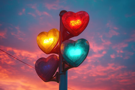 A whimsical traffic light shaped like hearts glows in red, yellow, and green as a vibrant sunset paints the sky.