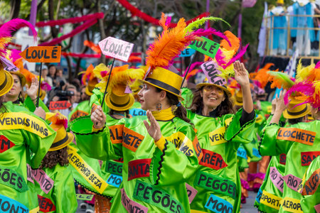 LOULE, PORTUGAL - 17th FEB 2024: Colorful Carnival (Carnival) Parade festival participants in Loule city, Portugal.