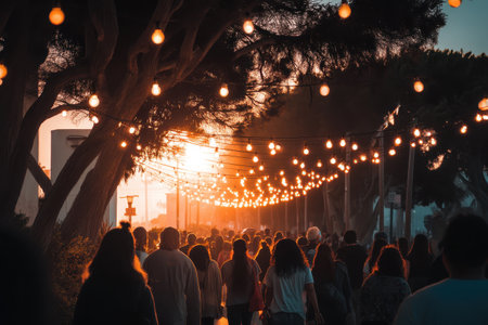 A vibrant scene of people walking beneath picturesque hanging string lights during a stunning sunset, creating an enchanting atmosphere among tall trees in an urban outdoor setting.