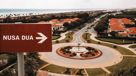 A clear sign points the way to Nusa Dua, Bali. This beautiful Indonesian resort destination offers stunning ocean views, manicured landscapes, and a serene getaway for travelers.