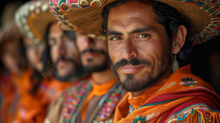 Hispanic Heritage Month. a group of Mexican men and women posing for the camera, wearing traditional in orange color with black background, all looking at front camera