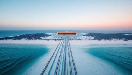 A modern structure sits on a remote sandy island at sunrise/sunset, with parallel tracks leading to it across the sand. Surrounded by calm ocean under a gradient sky, this unique image conveys themes