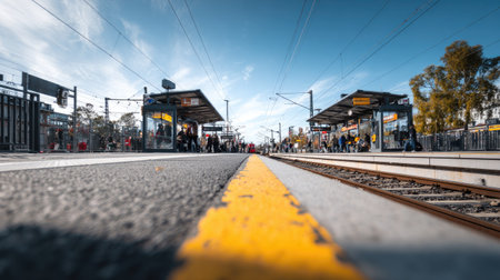 Two train platforms are visible in a low-angle perspective, bisected by a bright yellow line. Overhead structures shelter waiting passengers. The composition features a symmetrical arrangement, with tracks and infrastructure against a clear, blue sky. This image may be suitable for various commercial uses, including transportation and travel themes.