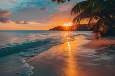 Experience the beauty of a tranquil tropical beach at sunset, featuring gentle waves lapping at the shore, framed by swaying palm trees and a vibrant sky.