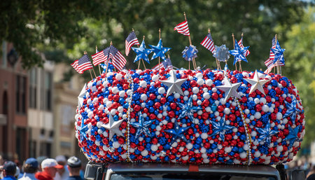 A car decorated with red, white, and blue flowers, stars, and American flags for a Fourth of July parade, celebrating Independence Day.