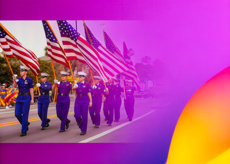 A group of uniformed officers participating in a ceremonial military parade, proudly marching with discipline. The scene is enhanced by American flags waving in the background.