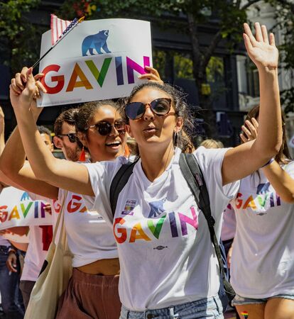 SAN FRANCISCO, CALIFORNIA, JUNE 24, 2018: GAY PRIDE PARADE - Mayor Gavin Newsom supporters march