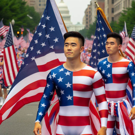 A group of people carrying colorful banners and flags, marching down a city street in a patriotic parade, A patriotic parade with colorful banners and marching bands