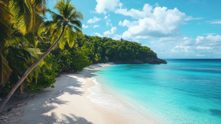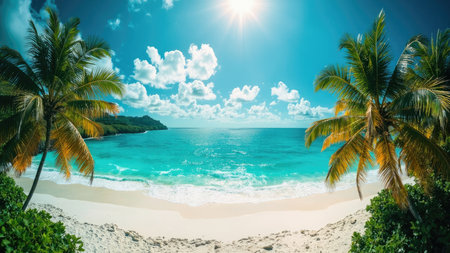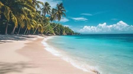 A breathtaking view of a tropical beach with pristine white sand, turquoise waters, and swaying palm trees. The image evokes a sense of tranquility and paradise, inviting viewers to escape to a serene tropical destination.