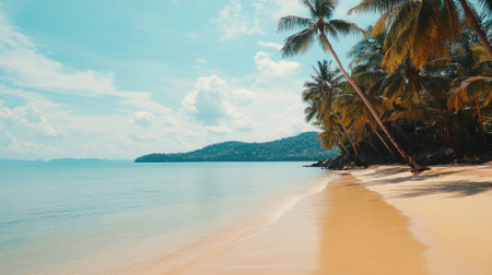 A tranquil tropical beach scene features palm trees gently swaying beside clear waters. The sunlit shore invites relaxation in a perfect getaway.