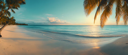 Illustration of a tropical beach at sunrise, with gentle waves lapping at the shore and palm trees swaying in the breeze. The soft pastel colors in the sky reflect the early light, giving the scene a dreamy, relaxing feel.