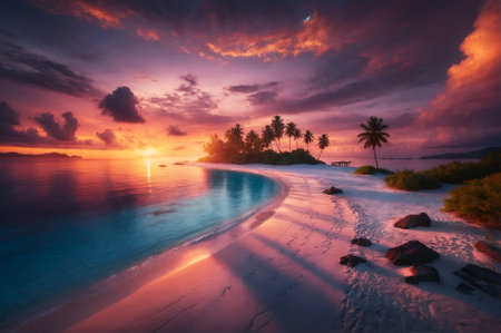 A stunning tropical sunset over a serene beach, featuring palm trees and gentle waves. Ideal for relaxation and travel themes with vibrant colors.