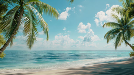 A tranquil summer beach with palm trees framing a blue ocean and blank space for creative content