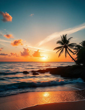 A stunning sunrise over a tropical beach, with gentle waves and palm trees silhouetted against a colorful sky, evoking tranquility.
