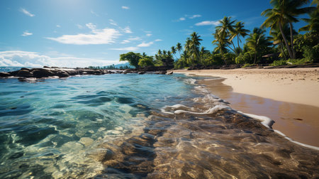 A serene beach showcases vibrant turquoise waters lapping at golden sands. Tall palm trees sway gently in the warm sun, creating a peaceful tropical atmosphere perfect for relaxation and serenity.