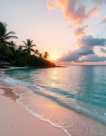 Illustration of a tropical beach at sunrise, with gentle waves lapping at the shore and palm trees swaying in the breeze. The soft pastel colors in the sky reflect the early light, giving the scene a dreamy, relaxing feel.