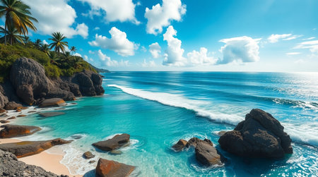 Beautiful tropical beach scene with palm trees, clear blue ocean waves, and a vibrant sky with fluffy clouds. Concept of travel and relaxation.