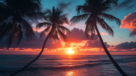 A breathtaking sunset casts vibrant colors across the sky and reflects on the calm ocean waves. Silhouetted palm trees frame the serene beach, creating a picturesque scene.