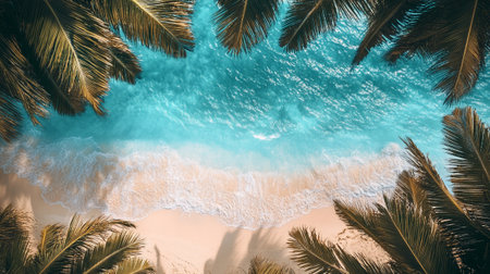 A stunning aerial view of a serene tropical beach featuring gentle waves lapping against the shore, lined with lush palm trees under the warm sun. Perfect for travel and relaxation themes.