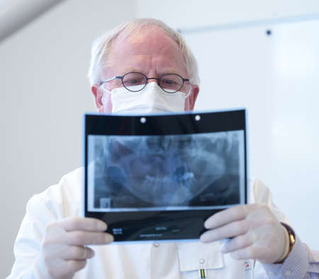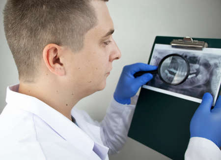 A dentist doctor examines a radiography of the teeth of a patient who has problems and teeth are inserted. The concept of research and diagnosis
