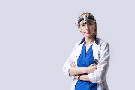 Confident ENT doctor wearing surgical headlight head light and protective glasses. Portrait of female otolaryngologist or head and neck surgeon on light gray background.